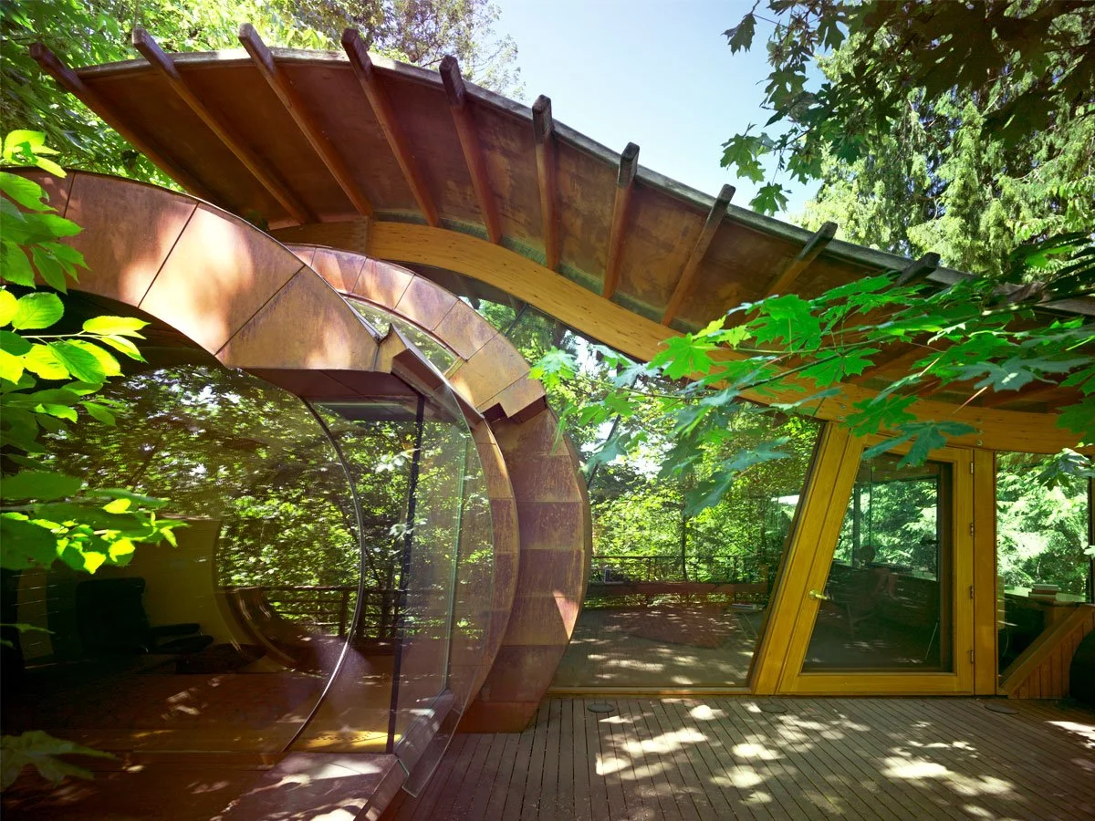 Our first geodesic dome house is an adaption of a standard shell with a second custom dome for an artificial intelligence guru. We built a team with a parametric designer to inlay a complex mathematical tiling pattern into the second dome.